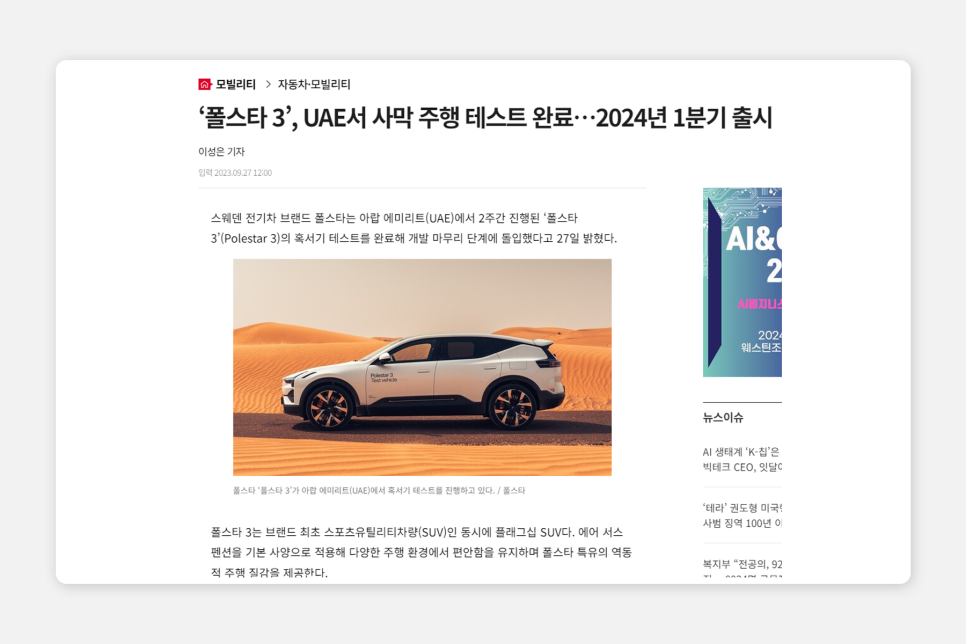기존 볼보 자동차의 강점이라 함은 세련된 디자인 외에도 '강력한 안전성' 이었는데요, 폴스타도 볼보의 뿌리가 있는 기업답게 안전성에 최우선으로 가치를 두고 있습니다. 특히 얼마 전 폴스타3의 혹서기 테스트 완료로 잠시 주가가 상승하는 모습을 보이기도 했었는데요, 전기차가 겨울철 일으키는 문제나 다양한 기후로 인해 발생하는 요소를 사전에 미리 방지해 나아갈 수 있다면 충분히 비싼 가격만큼의 브랜드로 발전할 수 있을 것으로 생각됩니다.