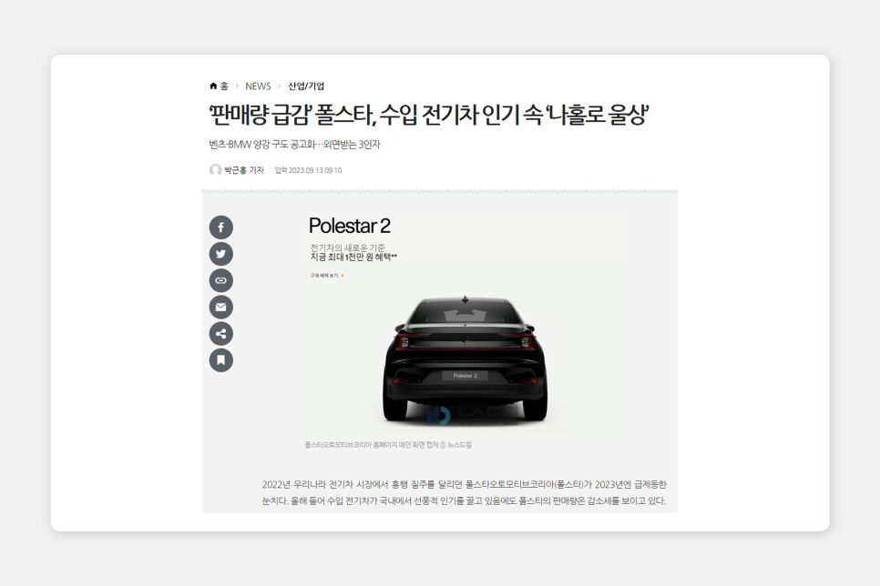 최근 글로벌 완성차 업계가 공격적으로 전기차 가격을 인하고 있는데, 이유는 경기 불황으로 인한 전기차 수요의 감소와 구매 보조금 삭감 등에 따른 원인이 큰 것으로 보입니다. 그렇다 보니 순수 전기차만 만드는 회사들 중에서도 브랜드 인지도가 낮은 회사들은 엄청 큰 타격을 입을 수밖에 없는데, 그 회사 중 하나가 바로 '폴스타'입니다.