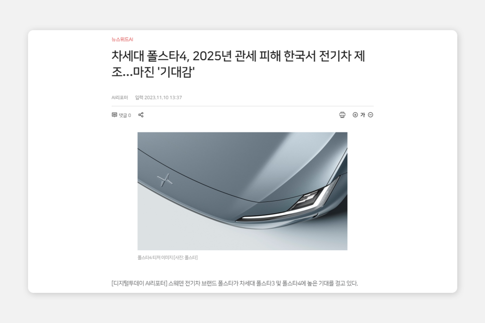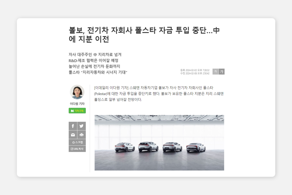 약간 개인적인 생각을 덧붙여보면, 현재의 폴스타의 상황을 보아 하면 약간 볼보를 지리가 처음 인수했을 때 느낌이 납니다. 스웨덴 예텐보리에서 볼보의 '고성능' 차량을 제조하던 기업으로 시작하여 '프리미엄 순수 전기차 브랜드'를 중점으로 홍보를 하고 있는 모습이 볼보의 초창기 지리 전략과 흡사해 보이죠. 기존 볼보의 기술력을 갖고 있음과 동시에 세련된 디자인 감성을 갖고 있는 것이 폴스타의 특징이자 장점인데, 지리 홀딩스는 이 점을 파고들어 제품 라인업을 어느 정도 완성시켰고, 앞으로 생산에 대한 구체적인 계획 (25년도 한국 르노 코리아 공장 생산 등) 을 제시하고 있습니다.