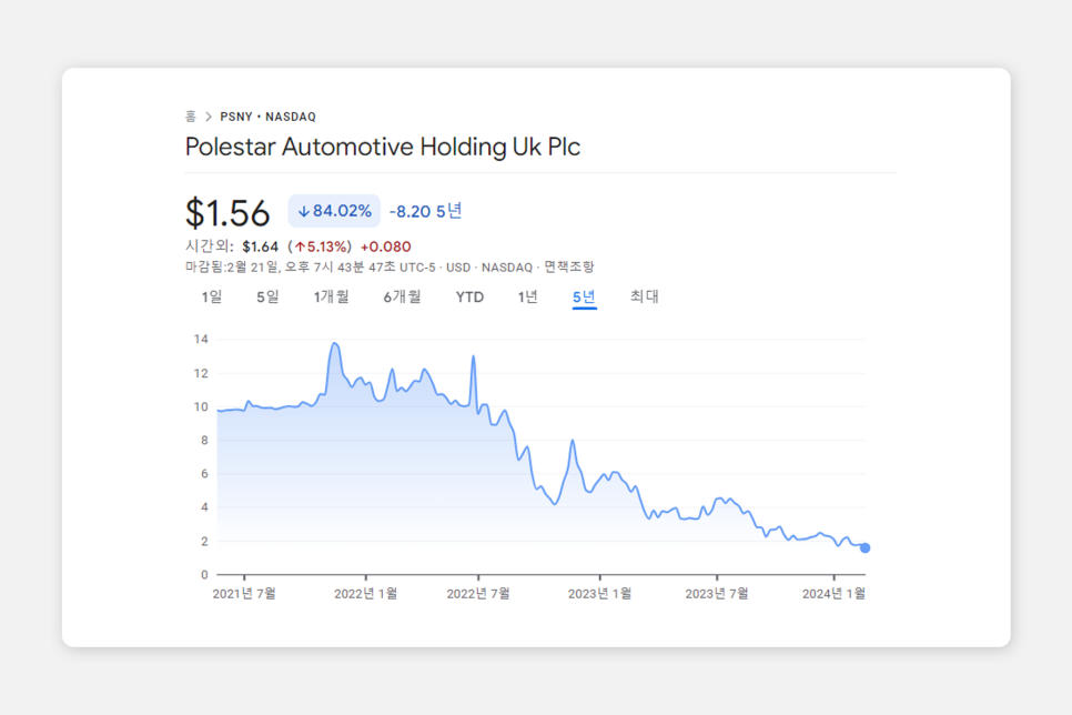 많은 분들이 제일 궁금하고, 답답한 부분이 바로 폴스타의 주가일 텐데요, 실제로 상장 후 몇 번의 상승 지점은 있었으나 꾸준히 우하향 하고 있음을 볼 수 있습니다. 약 10달러가량으로 상장했던 주가는 현재 1.56달러까지 떨어져 있는 상태입니다. 도대체 왜? 그렇게나 답도 없는 것일까 궁금하실 듯하여 몇 가지 대표적인 이유를 정리해 보았습니다.