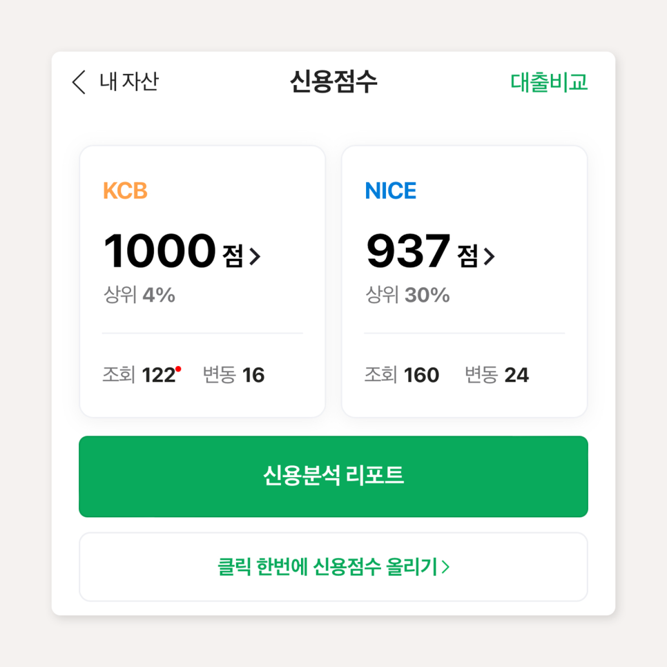 일례로 예전에는 금융위원회에서 신용조회를 이유로 신용점수가 내려가는 경우가 있었죠. 그러나 2011년 4월 이와 같은 문제를 개선키로 한 뒤로부턴, 신용점수 조회가 전혀 신용점수에 문제가 되지 않습니다. 신용조회 및 신용점수 관리는 최근 '네이버페이', '토스', '카카오페이' 등에서 손쉽게 하실 수 있고, '올크레디트', 'NICE지킴이' 등에서도 조회가 가능합니다.