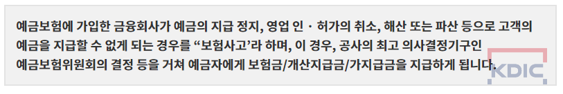 - 예금 지급불능 사태 방지 : 우리가 돈을 예치하고 있는 금융회사들 (예를 들면 농협, 신한은행, 카카오뱅크, 토스뱅크, ok저축은행 등등등)이 '영업정지'나 '파산'으로 고객의 예금을 지급하지 못할 때 '예금자보험공사'에서 시행하는 '예금자보험법'에 따라 고객에게 일정금액을 지급해주는 기능을 합니다.
