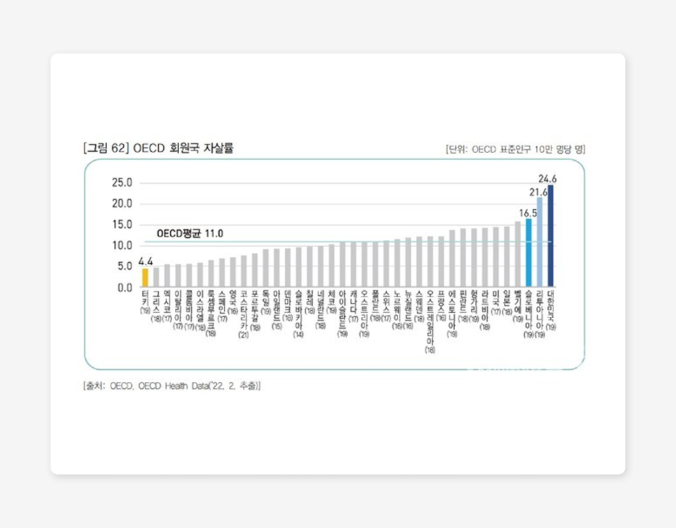 2021년 기준으로는 우리나라 인구 10만 명당 26명이 극단적 선택을 했다고 하네요.