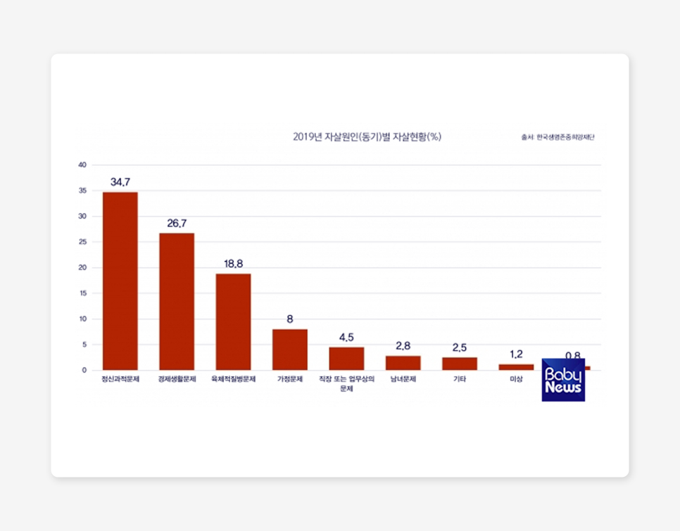원인 미상 자살건을 제외하고 원인을 찾아본 결과 34.7%는 '정신건강 문제'로 극단적인 선택을 했고, 약 26.7%가 '경제생활문제', 18.8%가 '육체적 질병 문제', 약 8%가 '가정문제', 약 4.5%가 '직장 및 업무 문제'로 극단적인 선택을 했다고 합니다.