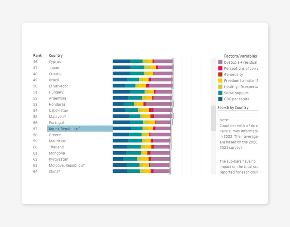 한국인들은 그리 행복하지 않다. 유엔 산하 자문기구 지속가능발전해법네트워크 (SDSN)의 2021 세계행복보고서에 따르면, 2018~2020년 한국의 행복지수 평균은 세계 149개국 중 62위이다. OECD 국가로