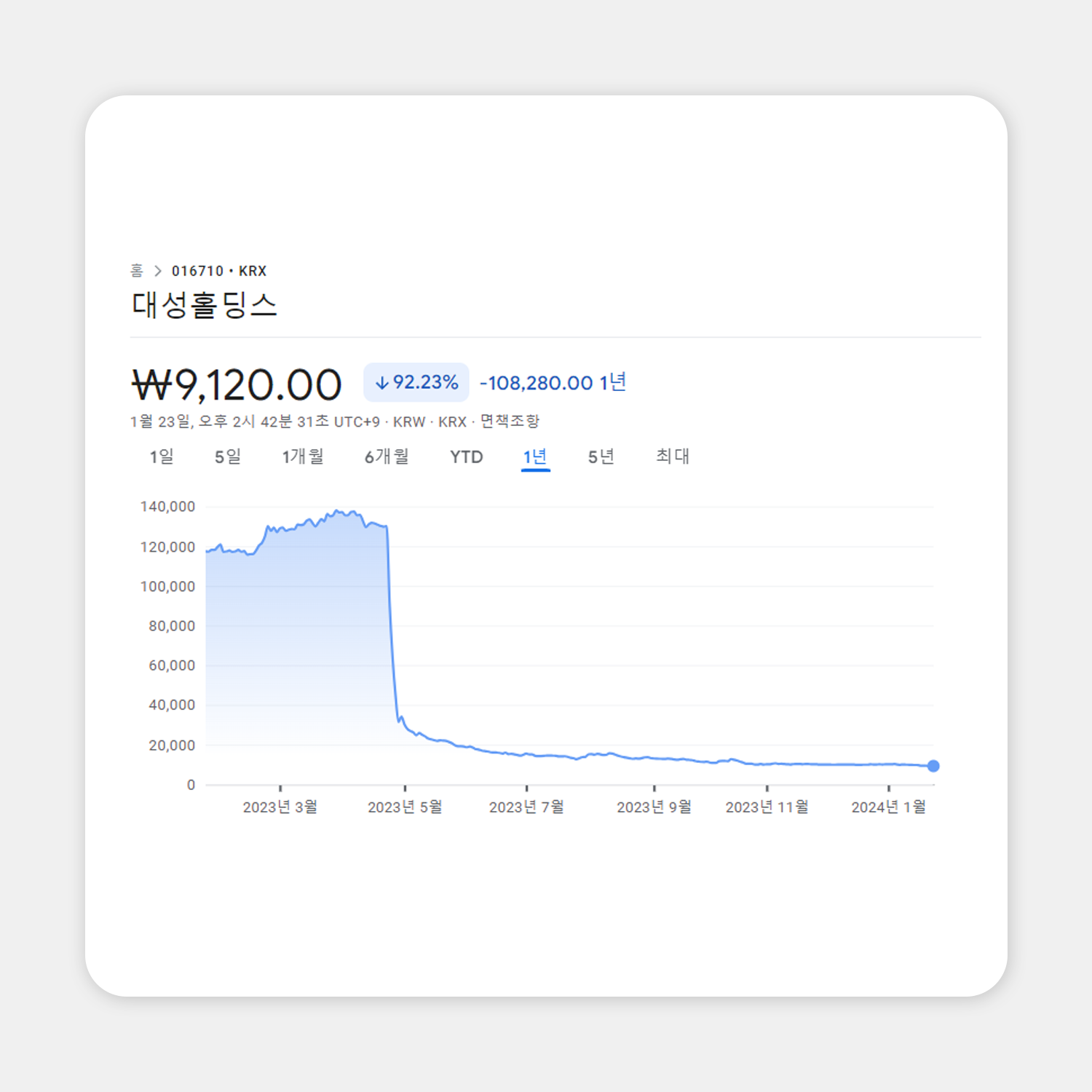 대성홀딩스는 대구도시가스 기반으로 각종 에너지 분야, 자회사 경영 컨설팅 및 M&A, IT 솔루션 제공 등을 영위하는 지주사입니다. 주가 폭락 직전까지는 기업 펀더멘탈이 좋았으나, 폭락 직후 23년부터는 실적도 지지부진하여 주가가 회복할 기미를 못 보이고 끝없이 하락 중입니다.