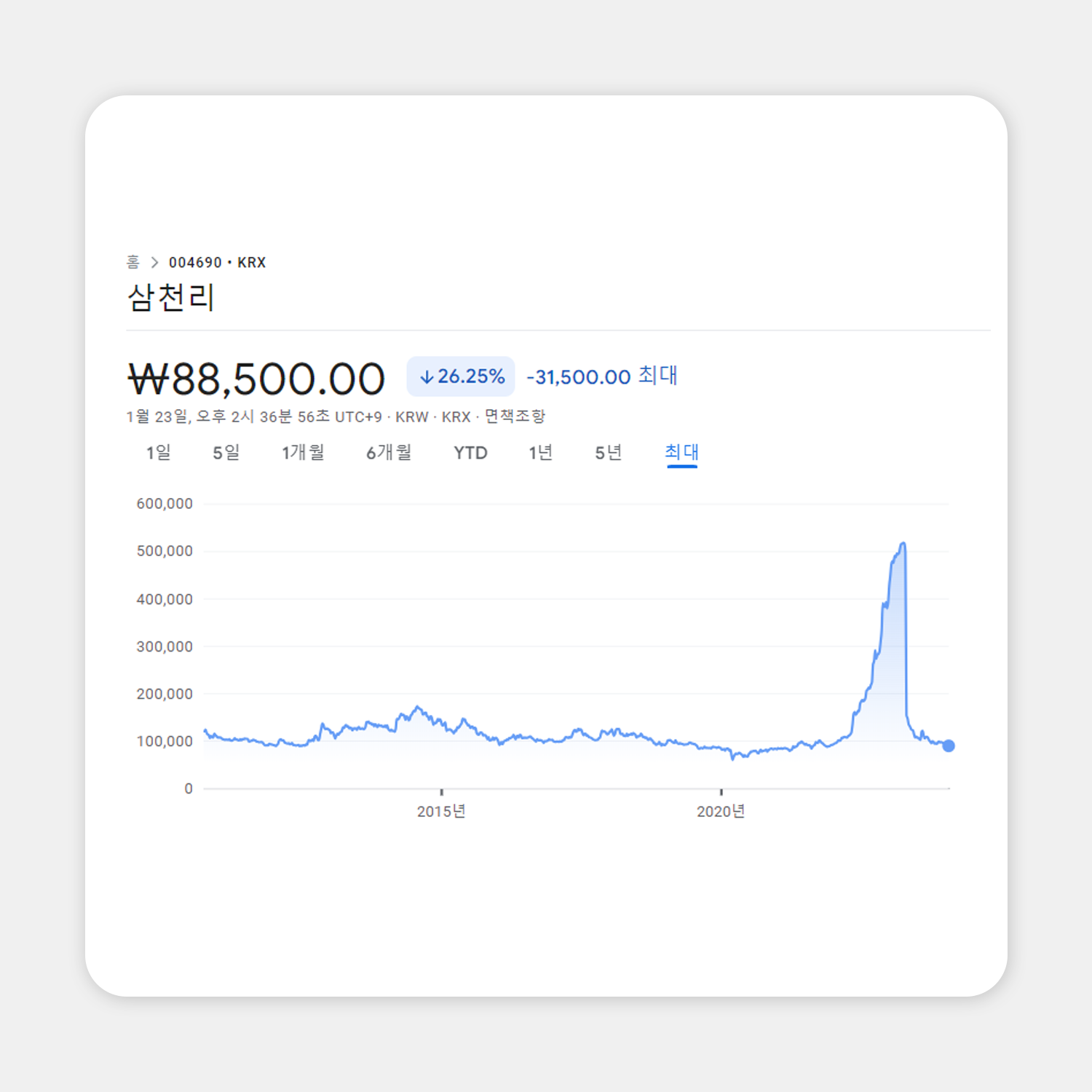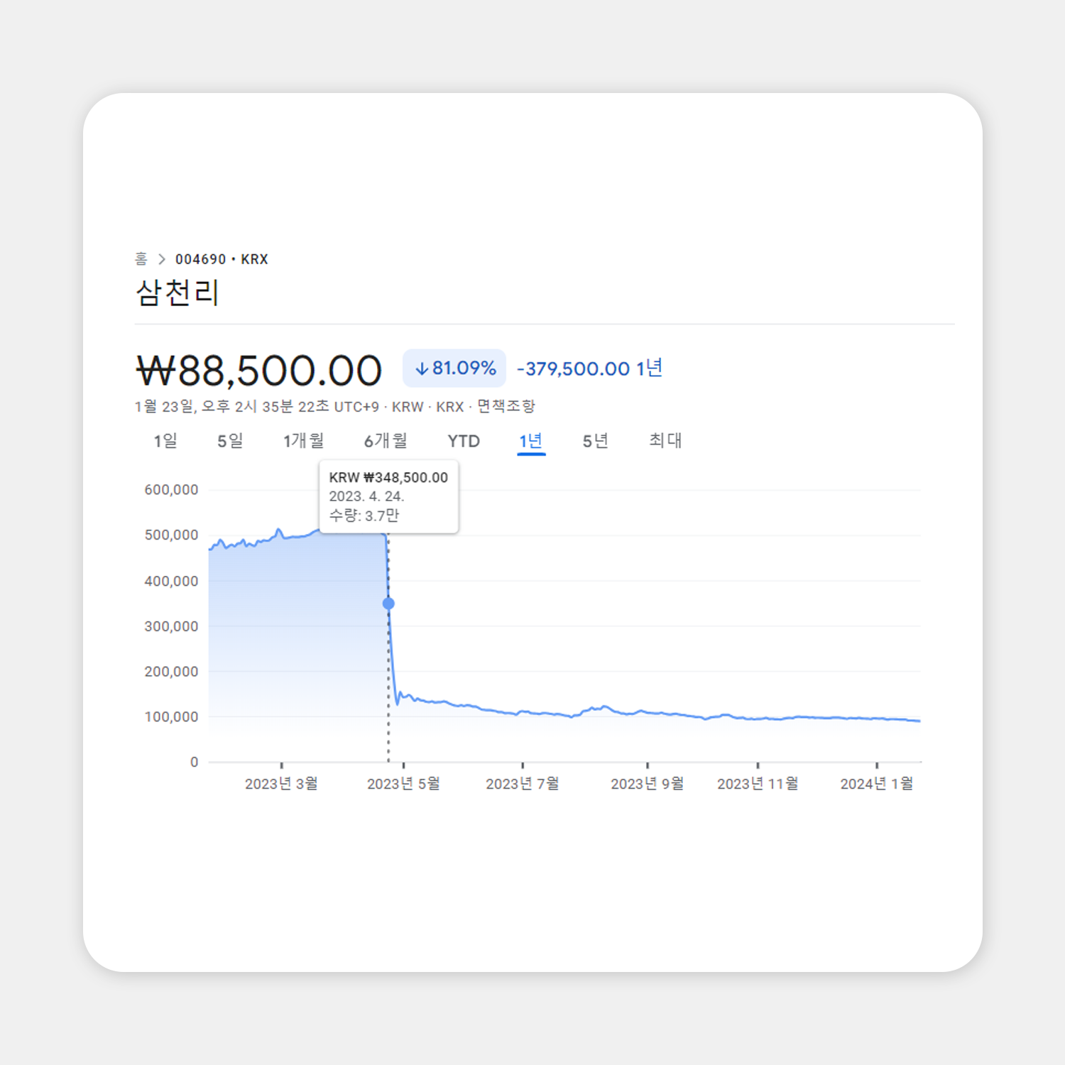 폭락 직전 51만 원대에 있던 삼천리는 3연속 하한빔을 맞고 계속 횡보 끝에 현재 8만 원 후반~9만 원 초에 주가가 형성되어 있습니다. 저 볼록 솟아있는 차트가 약 1년간 빌드업된 작전이었다는 것이 믿기시나요? 심지어 삼천리는 재무가 나쁜 편도 아니고, 꽤나 기업 펀더멘털이 좋은 편에 속하는데도 말이죠.