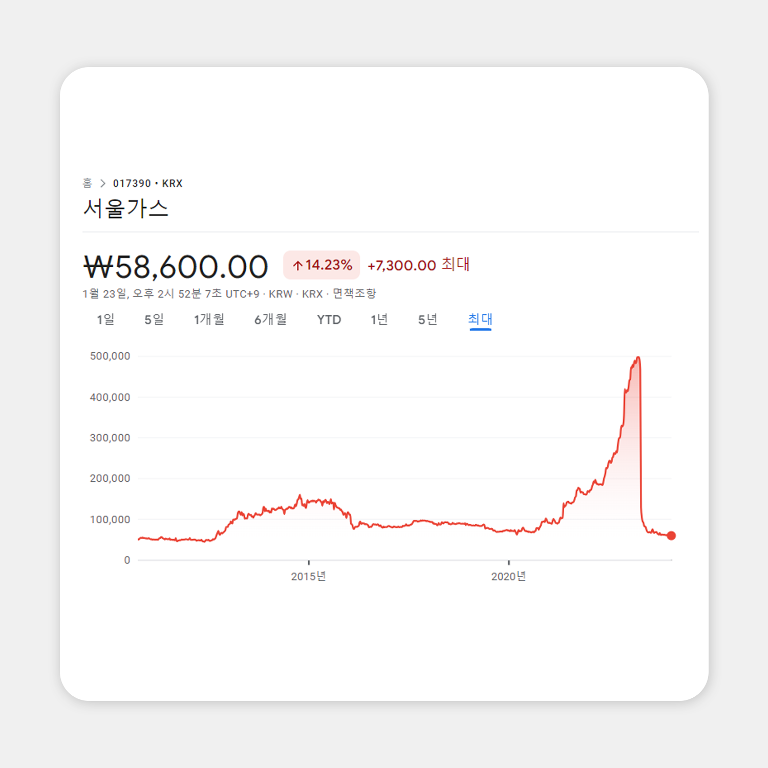 서울가스는 LNG 도시가스를 공급하고 있으며, 한국가스공사가 인도네시아 등 LNG 운반선을 통해 전량 수입하여 발전소 및 지역난방공사 등 대규모 수요자와 도시가스 회사에 공급하고 있습니다. 서울가스 또한 실적의 문제가 아니라 폭락 이후 이렇다 할 상승 아이템이 없는 것으로 보입니다.